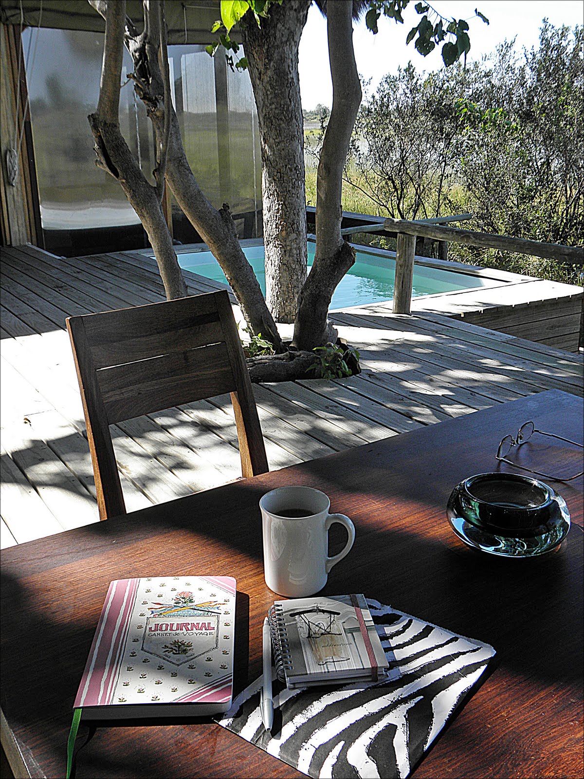 On a safari your trained guide/ranger is also your personal host. At Vumbura we were fortunate to have ST watching out for us every moment of our stay, from his booming "good morning ladies" at the gate at 6:00AM, to his walking us 'home' at night following dinner because guests are not permitted alone on the walkway to the tents in the dark. Hippos, elephants etc. often cross through the camp on their way to the water and one doesn't want to end up as an appetizer!